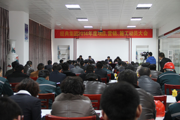 2月7日,為推進2014年度戰略目標順利實施,經典集團隆重召開項目營銷施工動員大會。集團公司高層領導苗樹文、杜福生、鄭建康、司紅玲、鄭利昌、高建國出席了此次會議集團公司有關部門負責人、項目經理、營銷人員、施工隊長、生產車間負責人等80人參加了此次大會。
