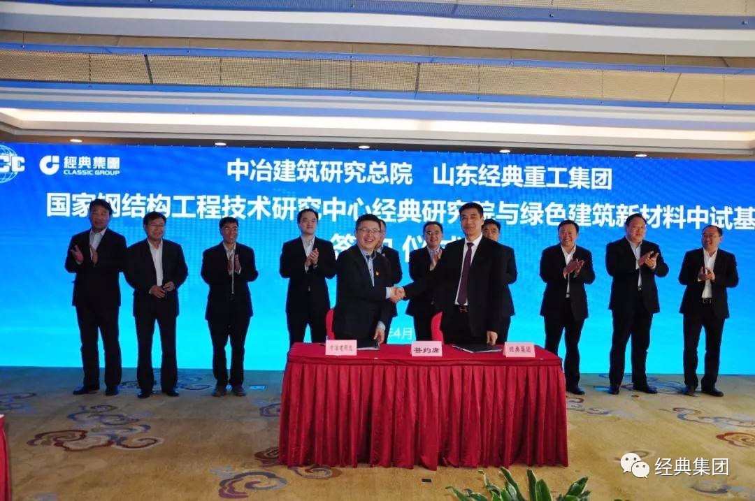 4月14日,山東經典重工集團股份有限公司與中冶建筑研究總院有限公司在北京簽署合作協議,成立山東中冶經典建筑科技有限公司,總投資15億元,在濟寧(兗州)建設國家鋼結構工程技術研究中心經典研究院與綠色建筑新材料中試基地,推進綠色建筑新材料體系產、學、研轉化,打造鋼結構生產制造、研發設計、建筑施工、產品檢測于一體的魯西南鋼結構產業發展中心。