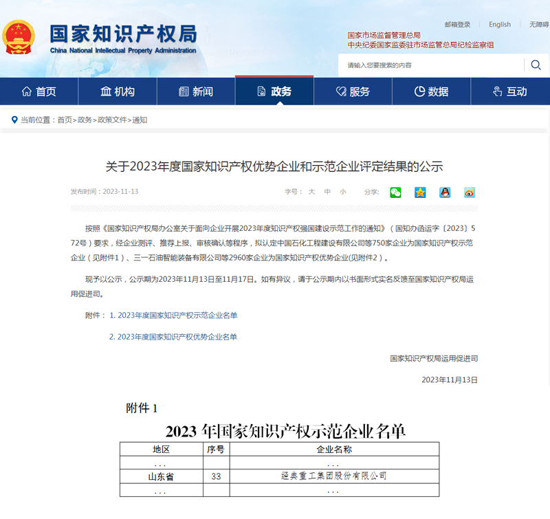 近日,國家知識產權局對2023年度國家知識產權示范企業和優勢企業評定結果的公示。其中,經典集團被認定為“2023年國家知識產權示范企業”。