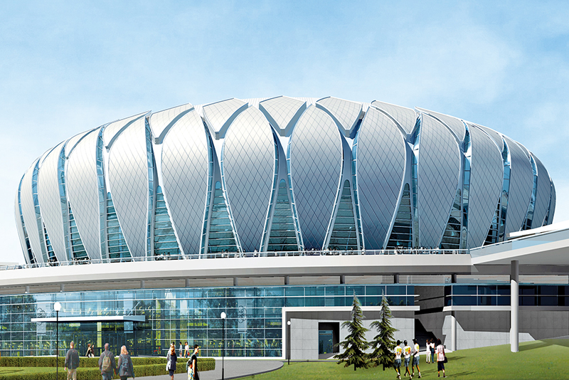 工程包括體育場、體育館及游泳館和相關配套設施,總用地面積211177平方米(約合316.7畝),總建筑面積156170平方米,體育場及周邊配套總建筑面積85470平方米,其中配套13266平方米,地下建筑面積14778平方米,地上四層,建筑高度40.23米。